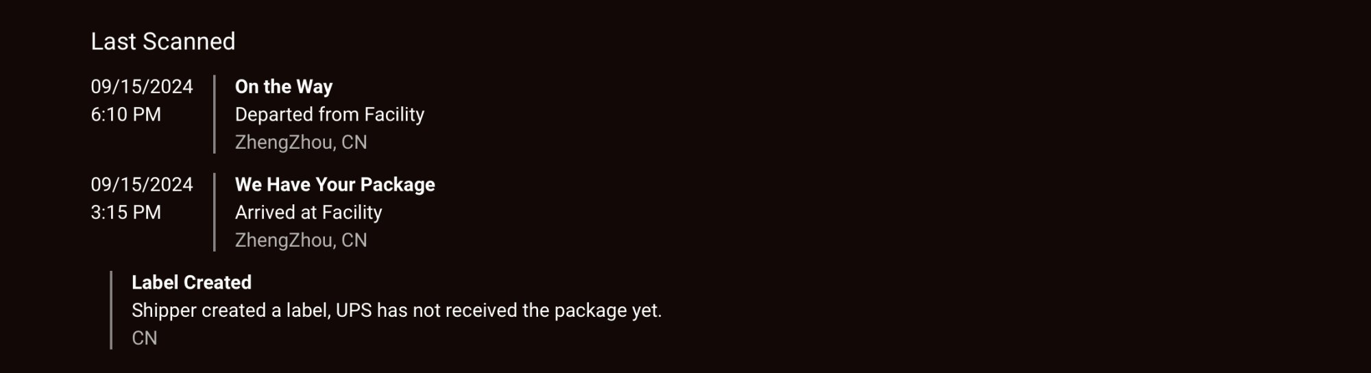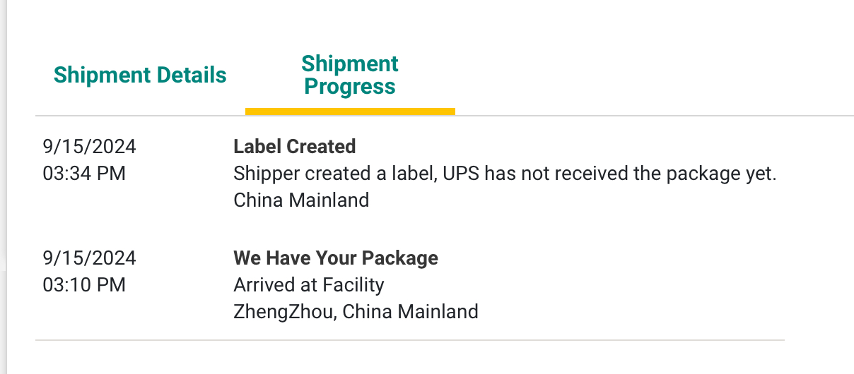 Order placed Friday morning at 8:02 am for home delivery to Atlanta Sep 20th, email confirmation within just a few minutes of that, cc charged within an hour for both. Saturday evening UPS My Choice showed two scans for Sep 15th between 3:00 and 3:15pm ZhengZhou (wave 2 I guess).