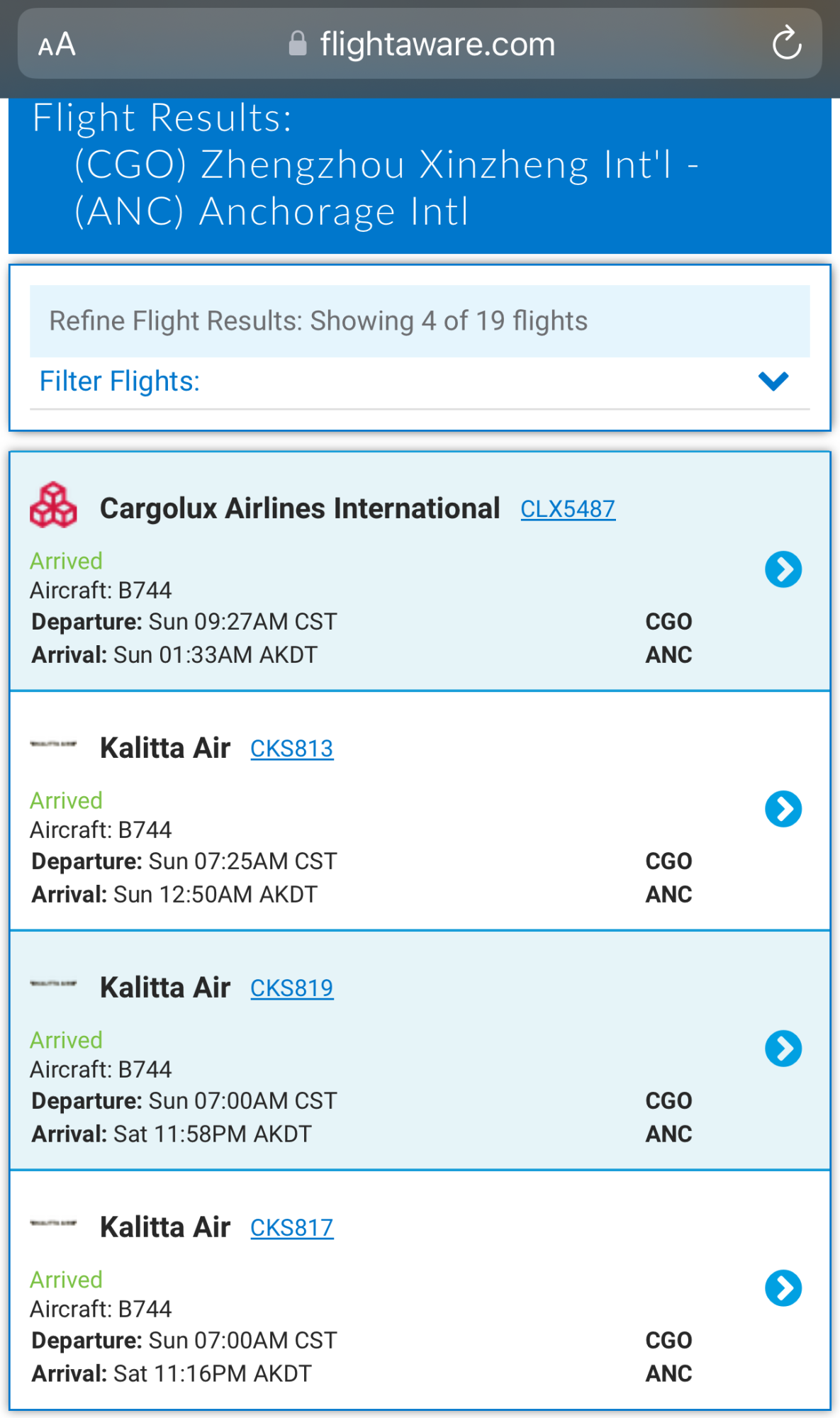 Last year and the year before that shipments went to Korea first then ANC.So assuming we leave from Zhengzhou for Alaska, it may end up being one of these flights (not necessarily today of course)