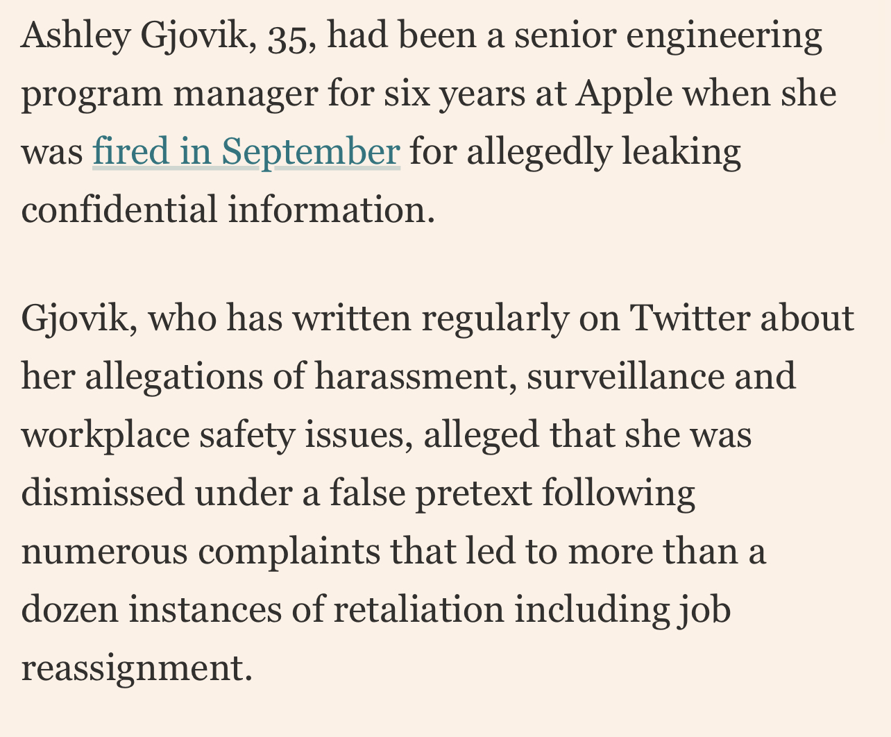 That being said if there is actual workplace harassment, sexual harassment, etc, Apple needs to do something about it or the DoL will.
