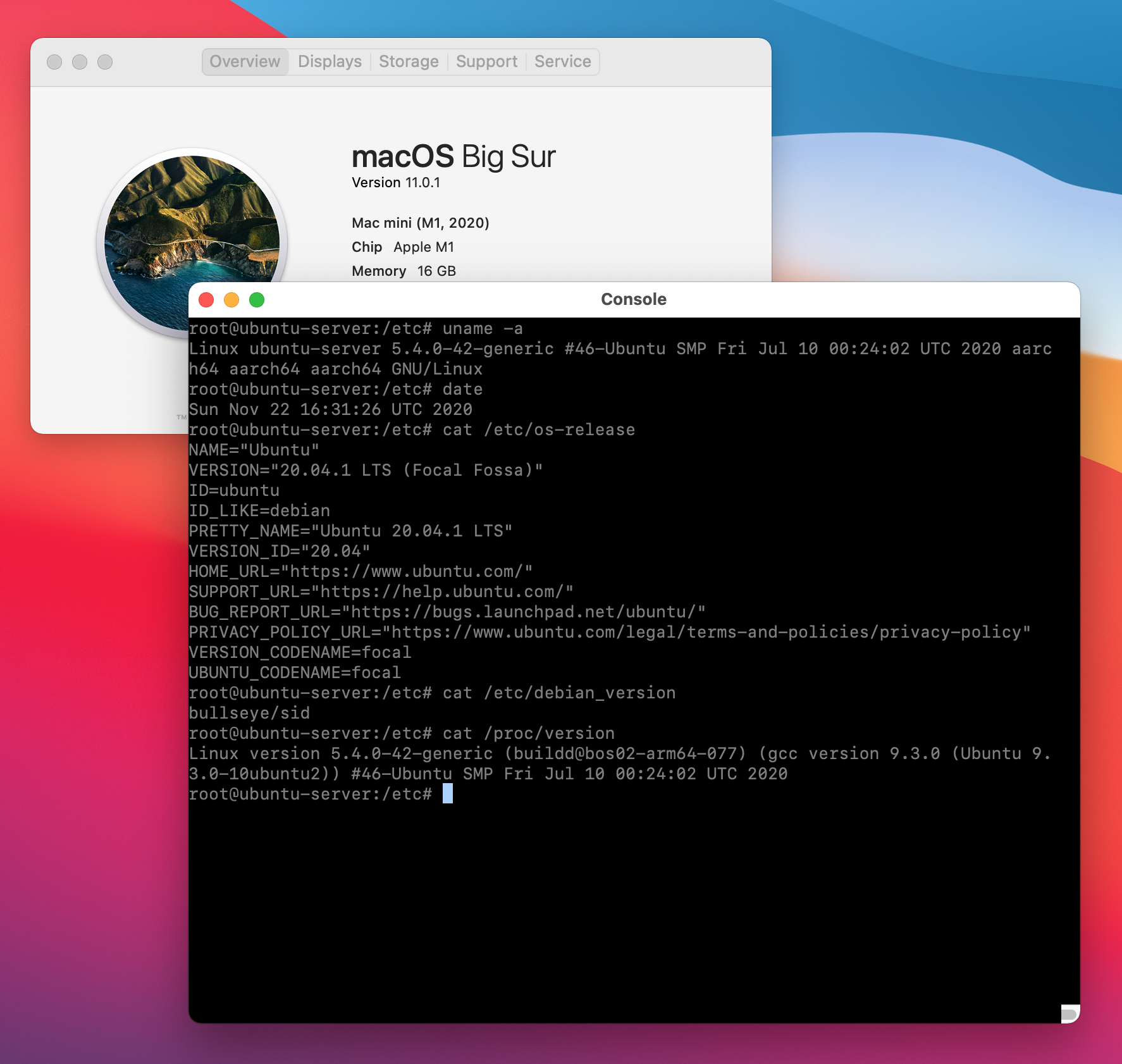 macOS Big Sur on a MacBook Air M1. Apple includes a hypervisor to allow ARM based VMs. KhaosT created an open source app that allows you to boot up an ARM system from ISO. So since Ubuntu has arm64 ISOs available, you can boot Ubuntu on your Mac and run it natively. Note that this will be a text only OS, as KhaosT hasn't implemented any GPU code as far as I know.How are you running this? Through what platform?