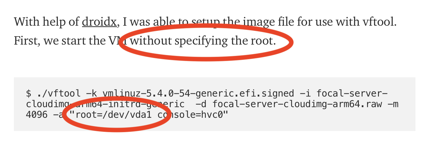 ./vftool -k vmlinuz -i initrd -d image -m 4096 -a "root=/dev/vda console=hvc0"