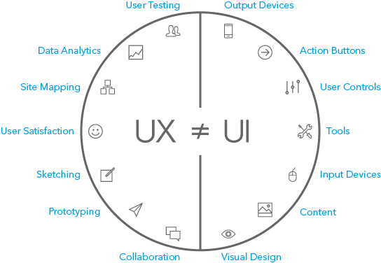 The basic though, UX is User eXperience this concentrates on the end to end journey to understand the user's mental modes, pain/gain points, interactions, and general user insights. Deliverables tend to be Personas, IA, journey maps, card sorts, wires, etc.