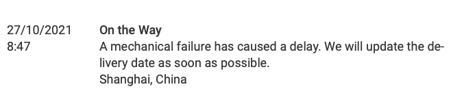 the message before was stamped as Shanghai, China - 27/10/20218:46 - "A mechanical failure has caused a delay. We will update the delivery date as soon as possible."