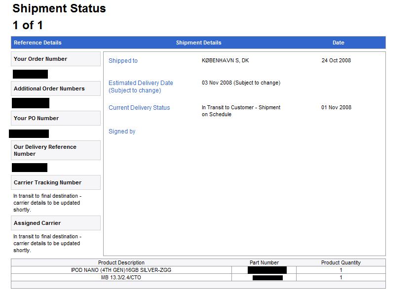 ) to recieve it tomorrow... I hope I'll get it tomorrow... do i dare to set the expectations ? my macbook + ipod touch order changed to 'in preparation to final carrier' or something on friday and then again changed to 'in transit to customer' yesterday. so i'm assuming my macbook is with TNT, UPS or whoever.. but i still have no tracking number