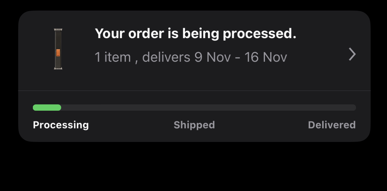 Even better than Apple predicted, it’s at the delivery depot and is scheduled for delivery today. Only slight snag is I need to watch the DHL snake instead of DPD who I normally get and🤞my wife gets to the front door in time as I have to go to work today eek.I have an Ultra with Black/Grey Trail Loop on order which was due for delivery 20th - 27th October but I have just had a message that the payment has processed and is now due for delivery 29th September to 3rd October 😀
