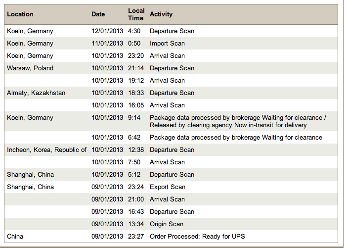 Koeln, Germany 01/12/2013 1:19 A.M. Package data processed by brokerage. Waiting for clearance.