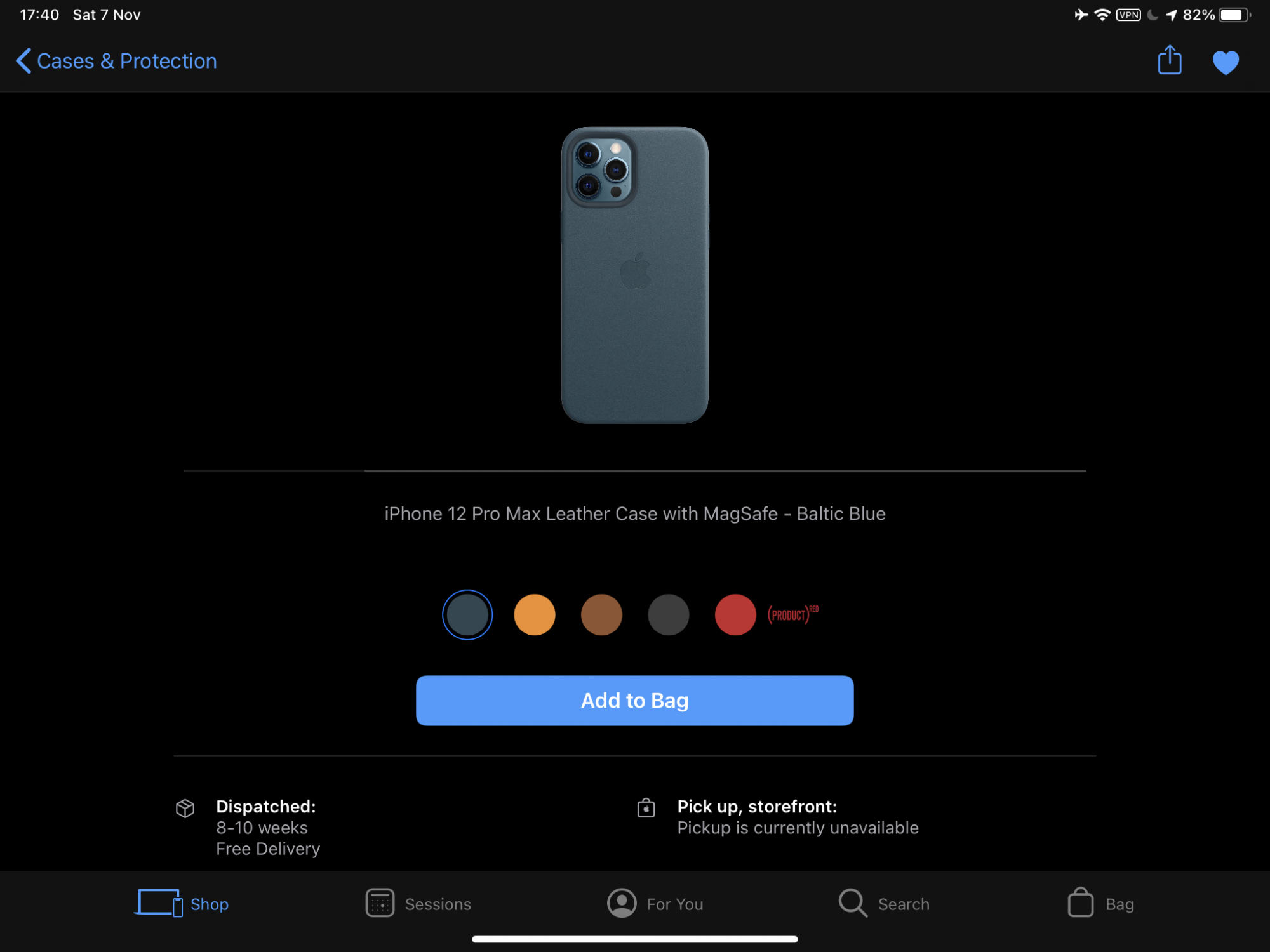 Can probably get one with storefront pickup at an apple store near you soon8-10 weeks wait for a baltic blue, 12 Pro Max leather case from Apple. 👀