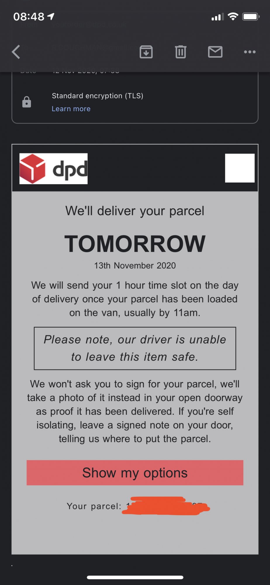 I have a notification in the DPD app stating that there is 2 parcels due tomorrow, one of which that they can't leave safe so I assume that's it (I think the 2nd parcel is work stuff). No email from DPD yet and the Apple status still shows due tomorrow.