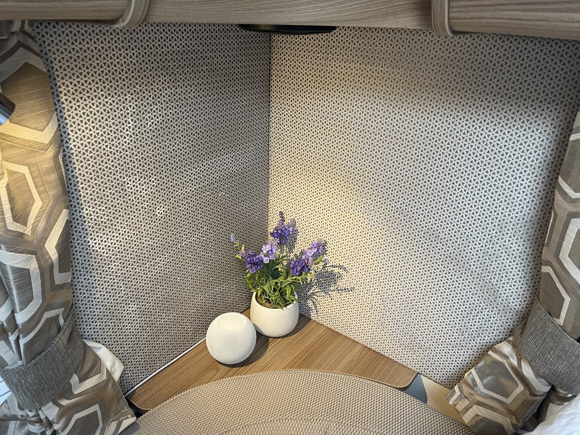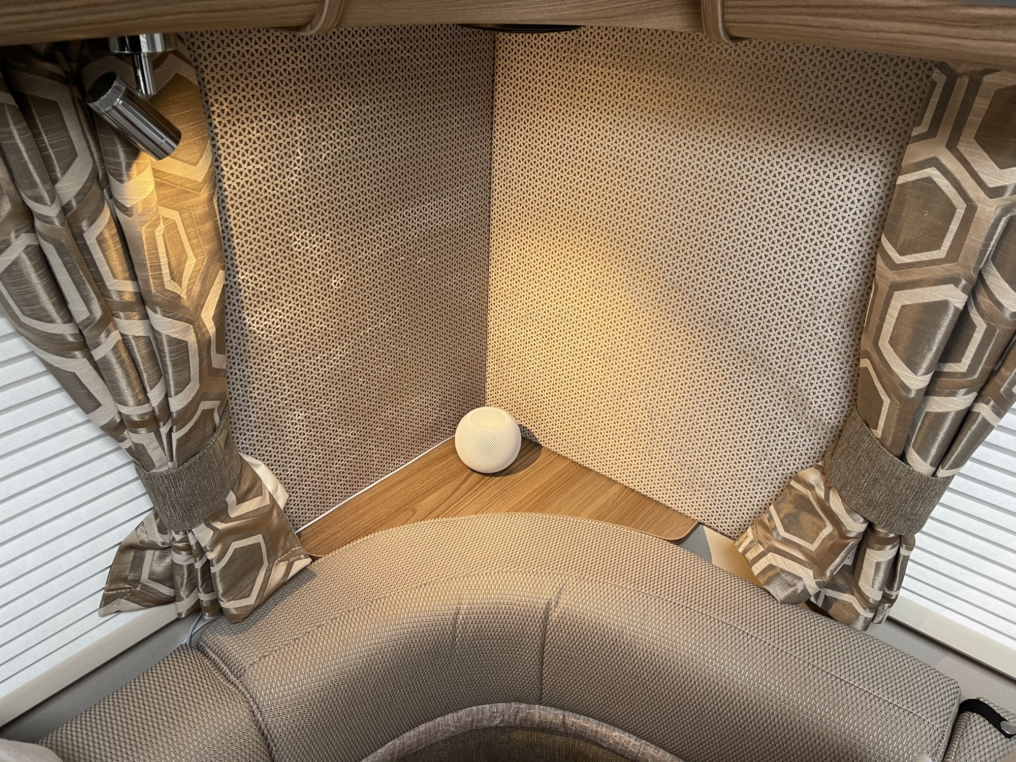 The HomePod Mini looks lost in my motorhome, need to hide the wire though. I had it playing in there and to be honest it’s going to need two, the sound was very poor, maybe too much soft furnishings absorbing it, I was worried even one would be too much but not at all, not that we will be wanting to rock away in it 😄