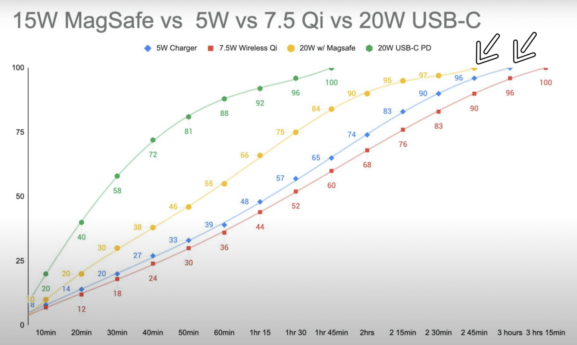 I was all in on getting the MagSafe charger for my new 13 Pro Max but then I watched a video on YT earlier today (). The image below (a still from the video) shows the charge rate compared to generic 7.5w wireless charging, standard wired charging, and fast 20w wired charging - MagSafe is yellow. It just kind of made me realise - when I would actually use it, over the 20w fast chargers every time?