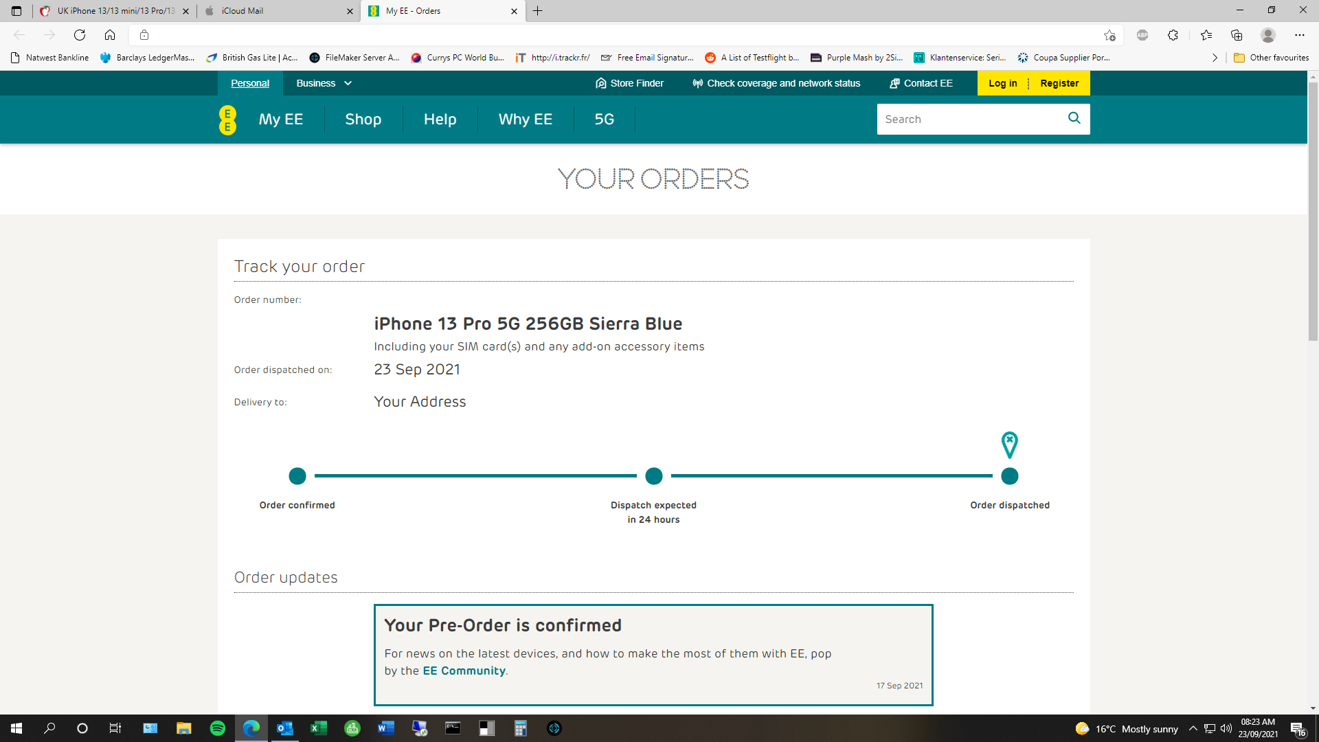 EE: Upgrade 256 13 Pro Max SB. Done via telephone call mid afternoon Monday (I was told 14 day delivery window). DPD notification offering choice of slots tomorrow.