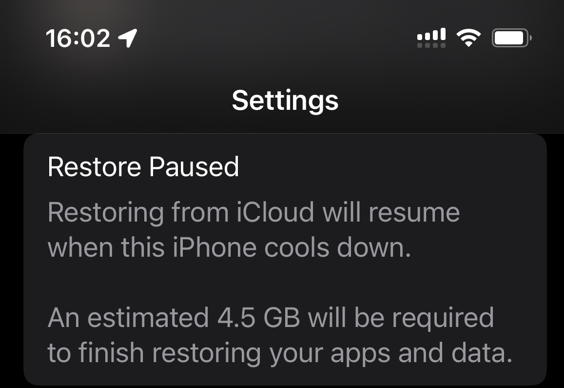 Currently I'm at around 40.5GB out of just over 125GB, and that's with me sticking my new phone on top of the back of the old one in what I'm hoping is an acceptable WiFi speed/thermals tradeoff (I think it's skipping my router entirely). Seems to be going at roughly 11MB/s.