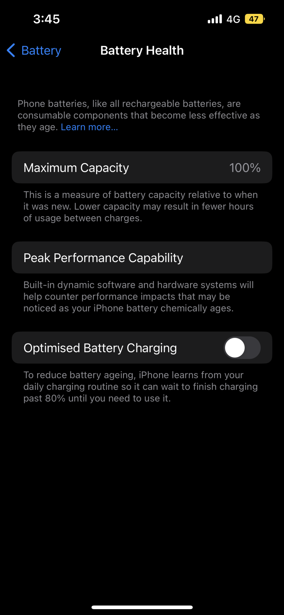 I'm at 100%, but my phone is technically only 5 months old (post-cancer all-mostly-clear present to myself off eBay). I'm currently mostly charging it using a 18W Apple (according to the box) charger with folding pins, again off eBay. For £7.Interesting to see so many at 100%. Do you guys make use of MagSafe/wireless charging at all? Wonder how much that affects things