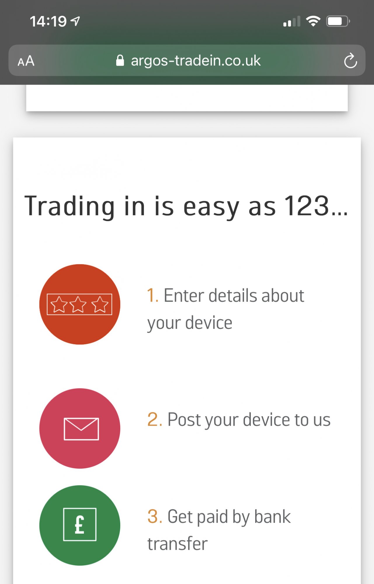 Whether you’re thinking “I want to sell my phone“ or “I want to sell my iPad”, Argos trade in has you covered. Search for your device, send it to us and get paid cash for your tech.www.argos-tradein.co.uk