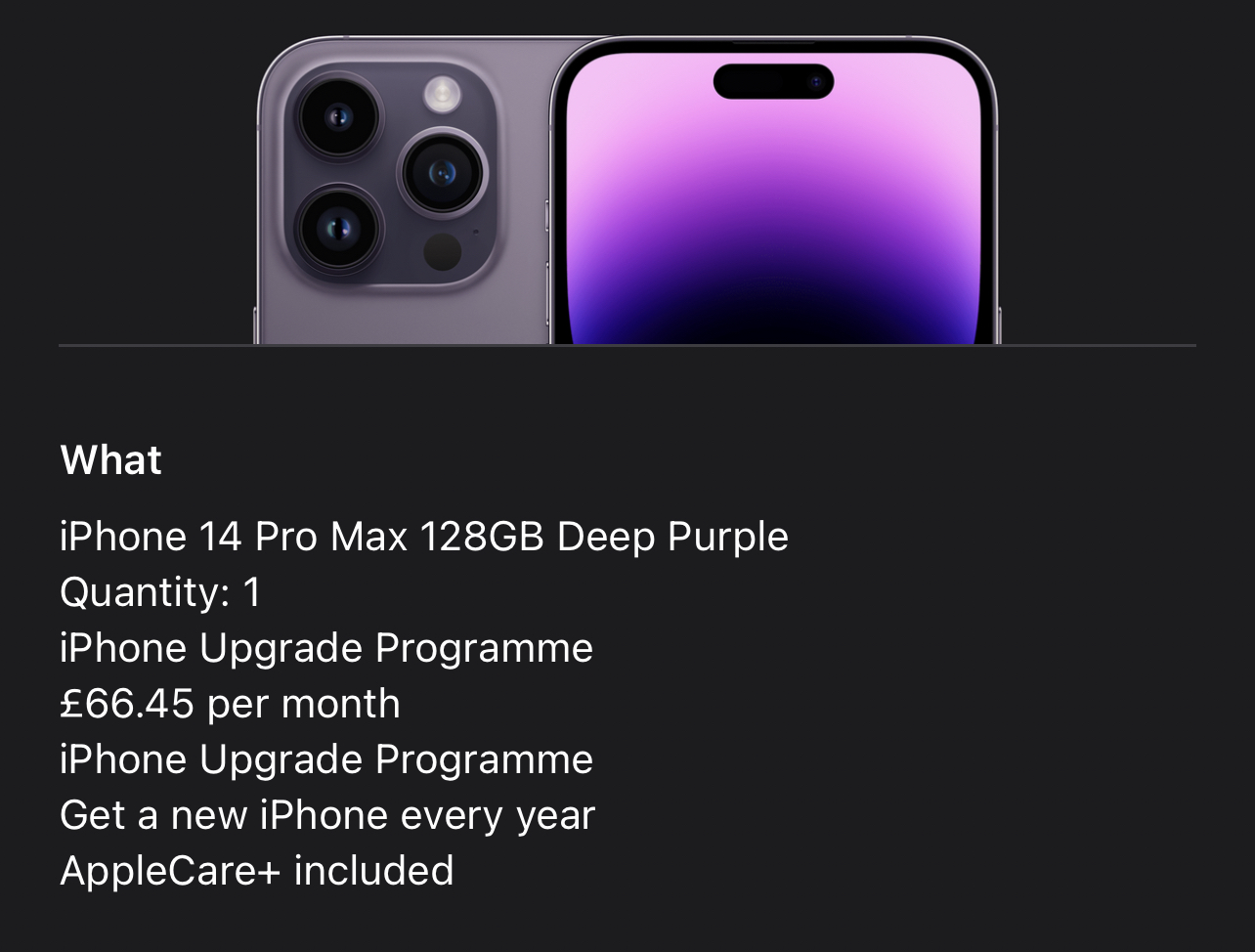I just noticed something, I reserved my iUP today and my reservation says I will be paying £66.45 a month but on the website the same configuration device costs £58.85 a month. Anyone got any ideas? I know I've got Applecare+ Theft but that is only an extra £3 a month.