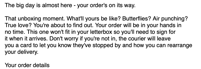 You sure? I still haven't receive any delivery email from them! Ordered on 9 Sep.Seems like Curry's is the best place to buy an iPhone from! They always get you your phone on time and use DPD every time. I won't use the Apple store next time.