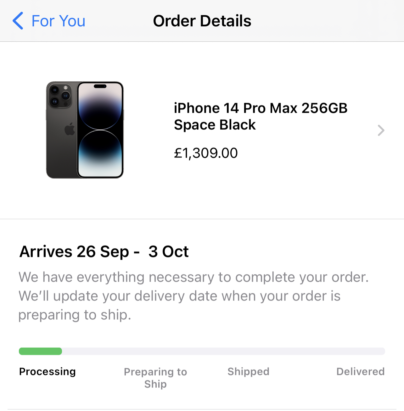 I'm having the same issues. No update or anything. Ordered a 128gb pro in purple, within 30 mins of it going live, and haven't heard anything sinceYeah. I'm just not very optomistic because there is no estimated delivery date! 🥶