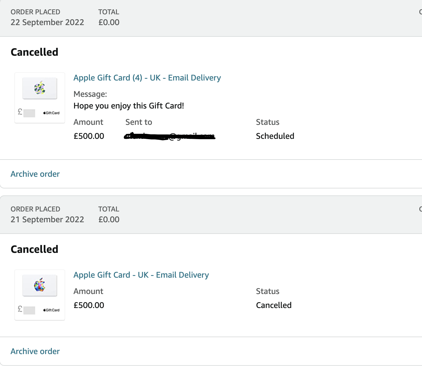 Be careful with that. I did exactly the same, they let me order 1 card for £500 and just kept cancelling the rest due to anti money laundering! lolNot sure on what to do….stick with Amazon order (est delivery 5 Oct - 3 Nov, already charged) or get refund and go hunting online for stock. I have a large amount of credit on Amazon though…..which I’d need to convert in Apple Gift card for the latter.