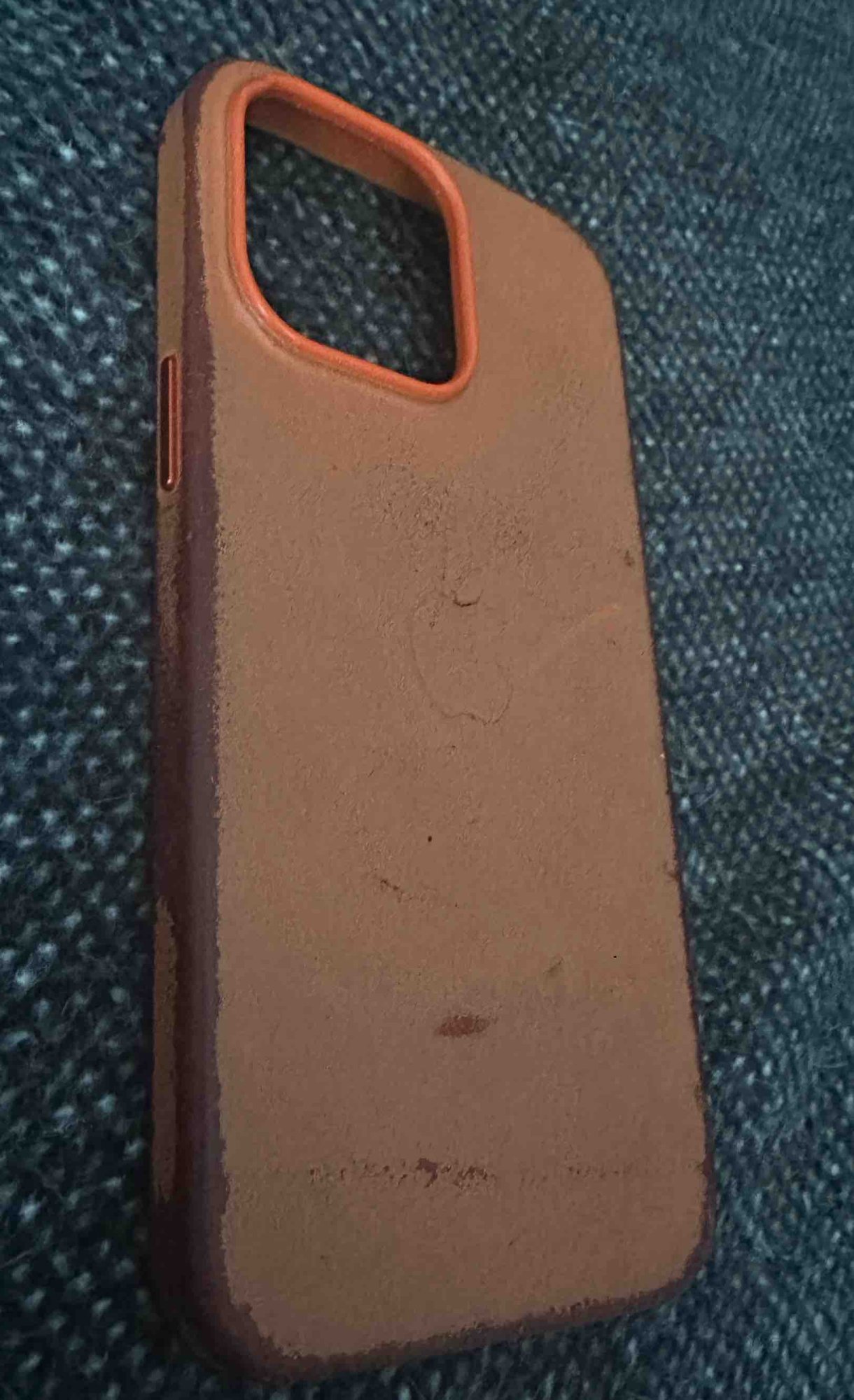 My orange leather one started peeling at the edges after about 10 months. Doesn't look quite as worn on the back as yours does though!Launch day 14PM still at 100%