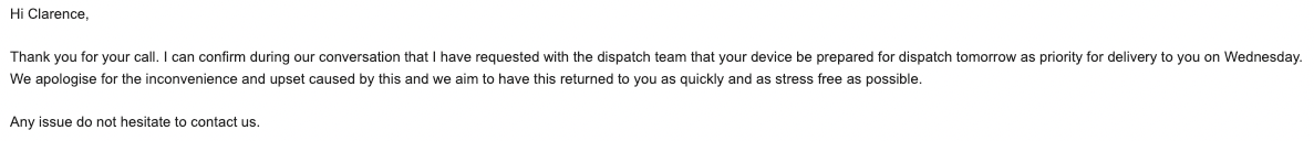 Disgraceful. 'We aim to have this returned to you as quickly and as stress free' as possible. Bit late for the stress free part. Bit late full stop really.Further update: After receiving no dispatch info for the courier for delivery the following day - which I was told on 3 separate occasions on the phone - I decided to call UR a fourth time around half-an-hour ago. After I was first placed on hold for ten minutes without response, I put the phone down and called again. I was told that, for whatever reason, they had missed the window to organise dispatch with DPD for today, and that the device, unfortunately, would be dispatched tomorrow instead. When I asked for a reason, though apologetic, they were incredibly unspecific about the reason.