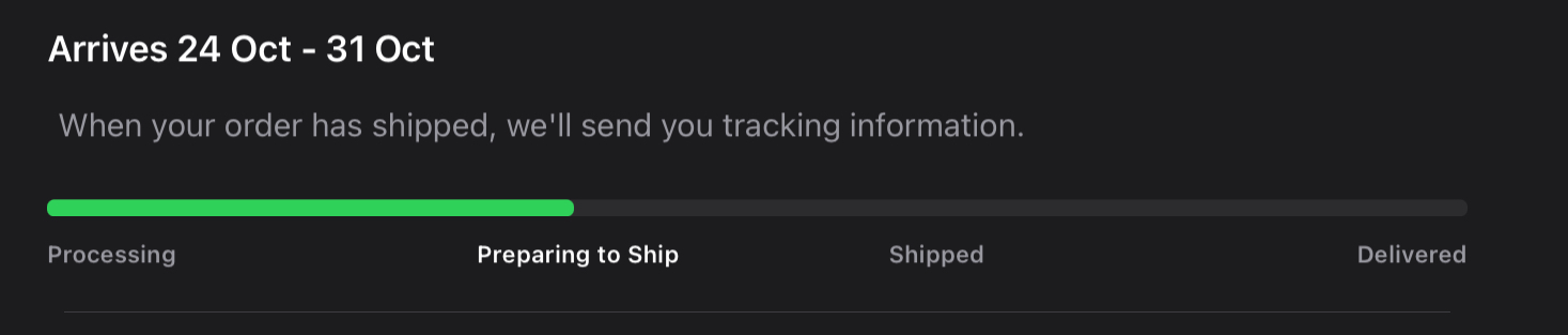 It's called having a bit of fun. Of course I know it means nada lolTo save your blood pressures, the green bar is meaningless - it only moves in relation to the label changing. If you look in the code of your order, you'll see a `currentStatus` key. Once that changes, the green bar will move, and it will look slightly different depending on your device, screen, browser size etc. I have a script checking mine every minute, because I'm a giant loser, which one day I may make available to other Apple losers to save the whole Green Bar Envy and keep everyone up to date on their extravagant purchases![]()
