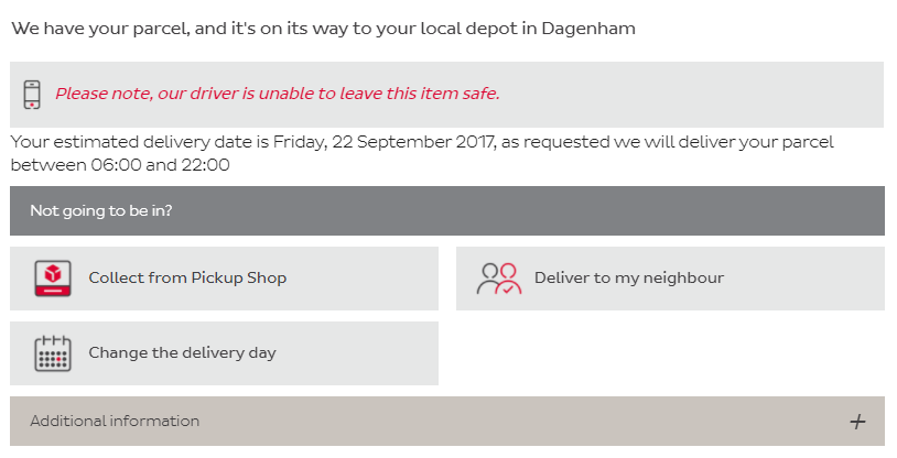 Yep, you're right about the safe place, however my tracking page allows to select to deliver to a neighbour - I can go through all the steps short of pressing SubmitPretty sure Apple have pretty strict restrictions with the couriers which don’t let them deliver to a neighbour or leave in a safe place. Has to be signed by someone at the delivery address IIRC