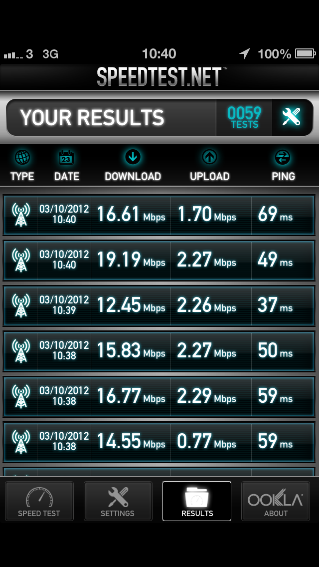 The 3G network is also a little spotty jumping wildly from 10-15mbps to below 0.5mbps from time to time. Speeds have been below 5-6 much more often than they have been above that comfortable threshold.