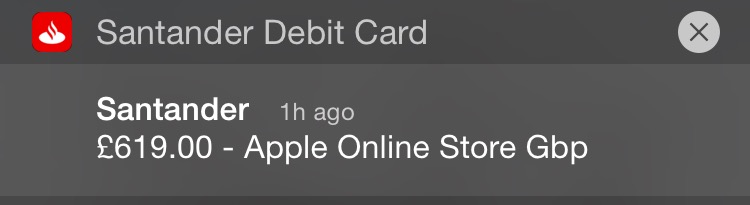 It's an Apple Pay notification, it's nothing to do with the Santander or Spendlytics app.How do you get iOS alerts from Santander? I can only set up text/email alerts for payments over £50 (Or somewhere near that), would be good if I can get alerts for all payments.