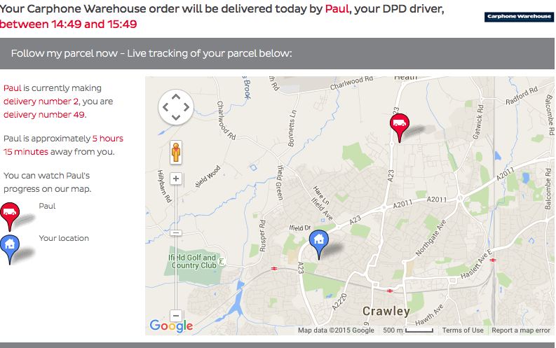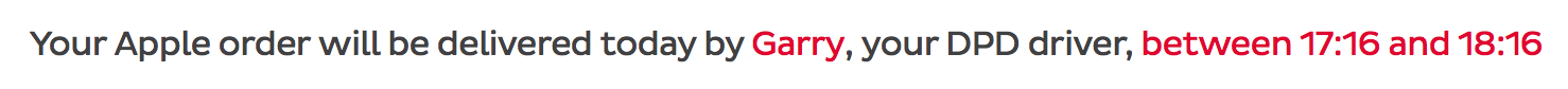 Your order will be delivered today by Asif, your DPD driver, between 12:28 and 13:28