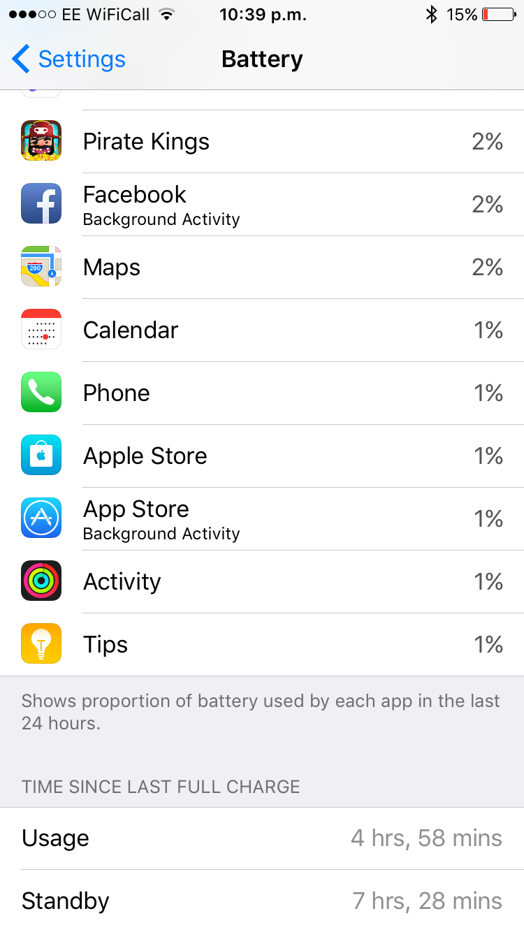 Point is, I'm using this far less intensively than my 6 plus. All syncing and app downloading was complete before I unplugged it at 3.15pm with a full battery. In 6 hours, I've only texted and checked a few emails. It's been in my bag most of the time. All apps were quit and there was a stong mobile signal and wifi. I am using this lightly compared to my iPhone 6 Plus, where I just used it, played games, app background refresh etc, but the battery life is a third.
