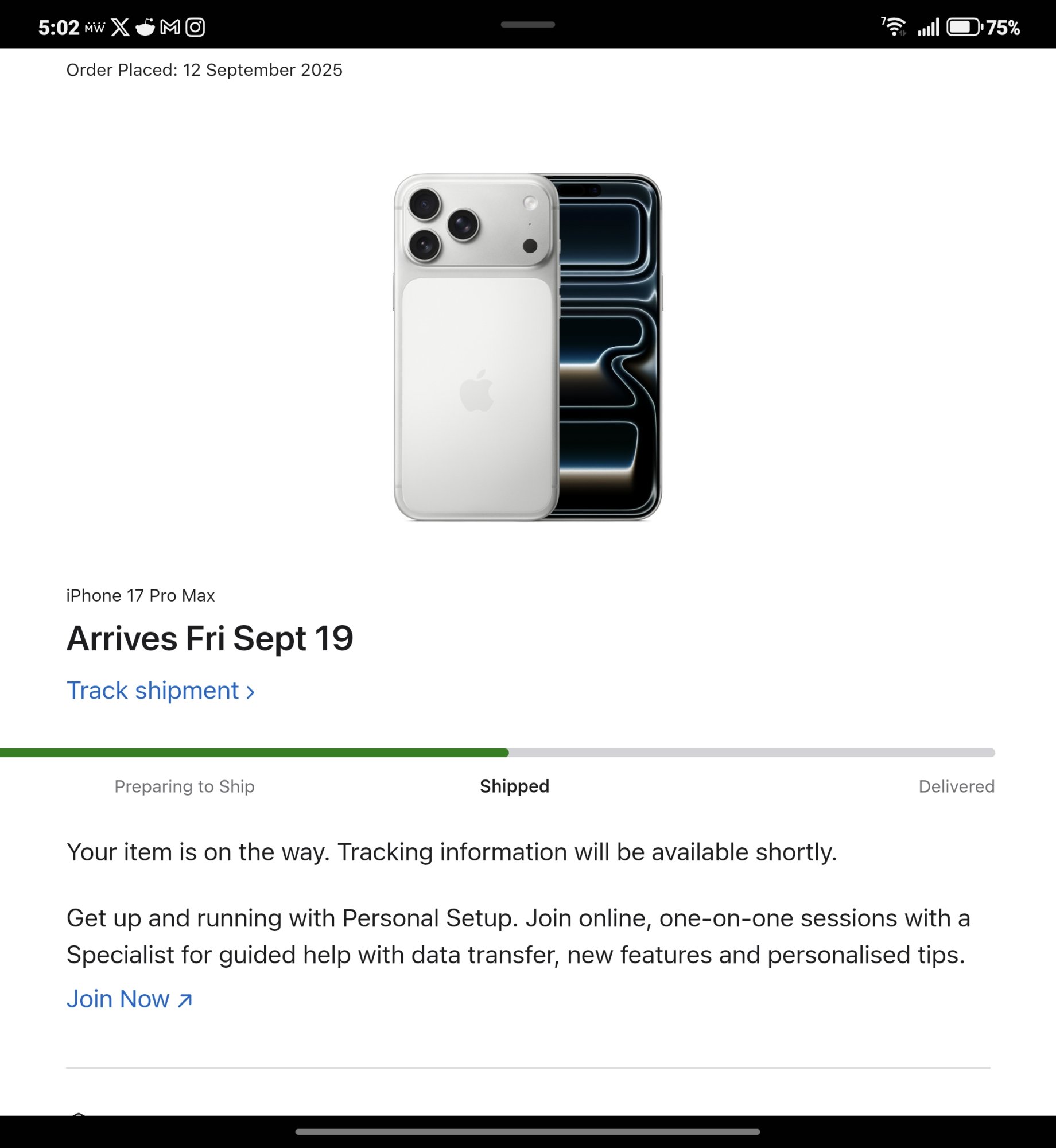 I've got the same, both orders now shipped but the ETA on the order still shows 24th to the 29th but got tracking. So fingers crossed both phones arrive tomorrow. Woo hooMy Pro Max that was saying 24th-29th has just changed to shipped so there is hope!