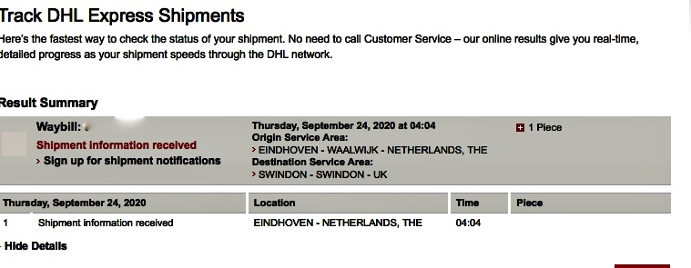 I think there is confusion - "Eindhoven shipping information received" means DHL is waiting for your package to arrive in Eindhoven before they handle it locally. it doesn't mean it's arrived there. Indeed, they seem to be taking 1 week+ to get from China to Europe, at least with DHL.