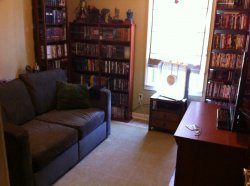 TV.  I have a internet only cable service that is $30 monthly with standard TV channels.  I find it streams Netflix very well since most of my viewing is either Netflix or off my computer with Apple TV.  I am still thinking over Hulu Plus.  I also have an old Sony 5 disc DVD player.  Yes, those are all DVDs on the shelves and a few CDs (the CDs are all ripped on my iTunes so they never are opened again).  The sofa is a Lovesac Sectional and can be moved around in endless configurations.  I have more pieces that you can not see in these pictures.  I attach my Macbook Pro if I want to get on the internet.I have an ATV2 on 4 TV's, and would probably get more if Netflix would allow more than 6 devices to access the service. Mini with a 8tb drobo and a 3tb external. EyeTV running on the mini catching shows off my Fios DVR box. AirVideo server running, TVMoboli DLNA server running, iTunes running.