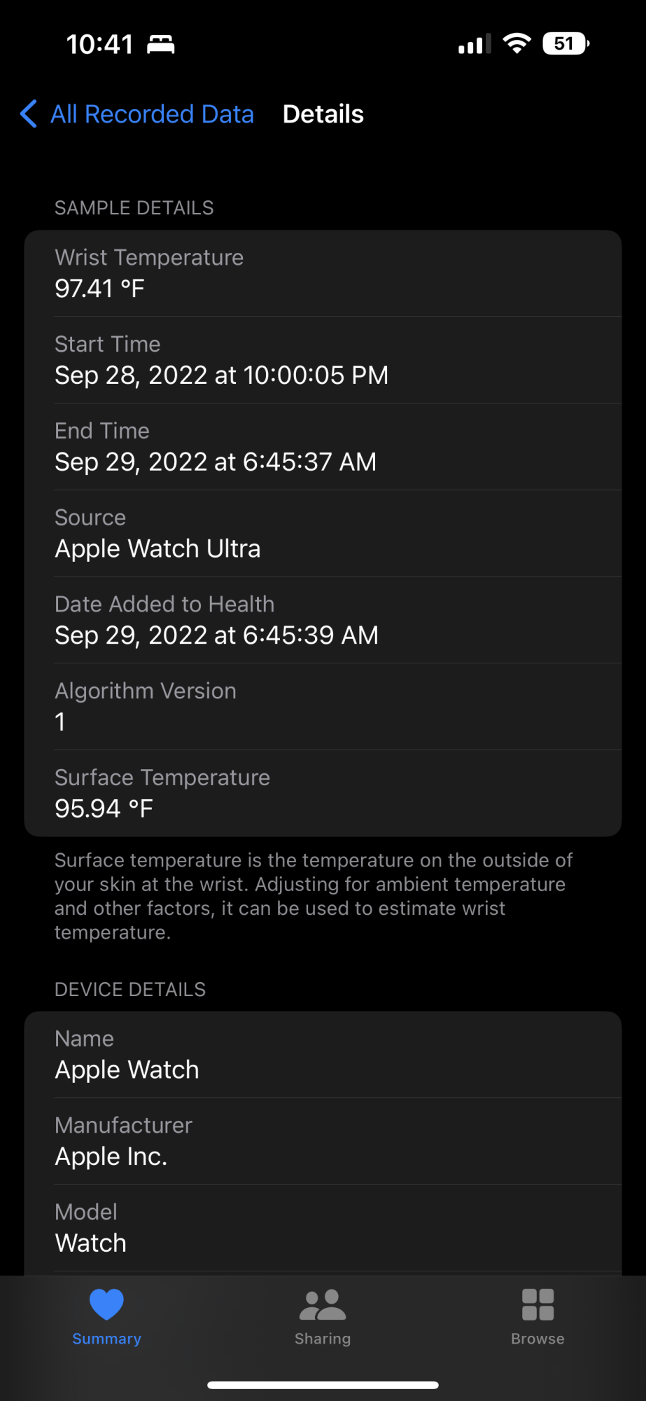 I had no idea either, thanks for the info lol!View attachment 2084157In case nobody else knew (like me until today😂) you can actually check the actual temperature reading in the health app as well. When you’re in wrist temperature you scroll to the bottom and click “show all data” and then click into whichever day. The temperature reading is at the top. I think that’s a nifty feature. I’m guessing it’s an average of your temperature overnight since I’m sure it does multiple readings but nice to be able to see.
