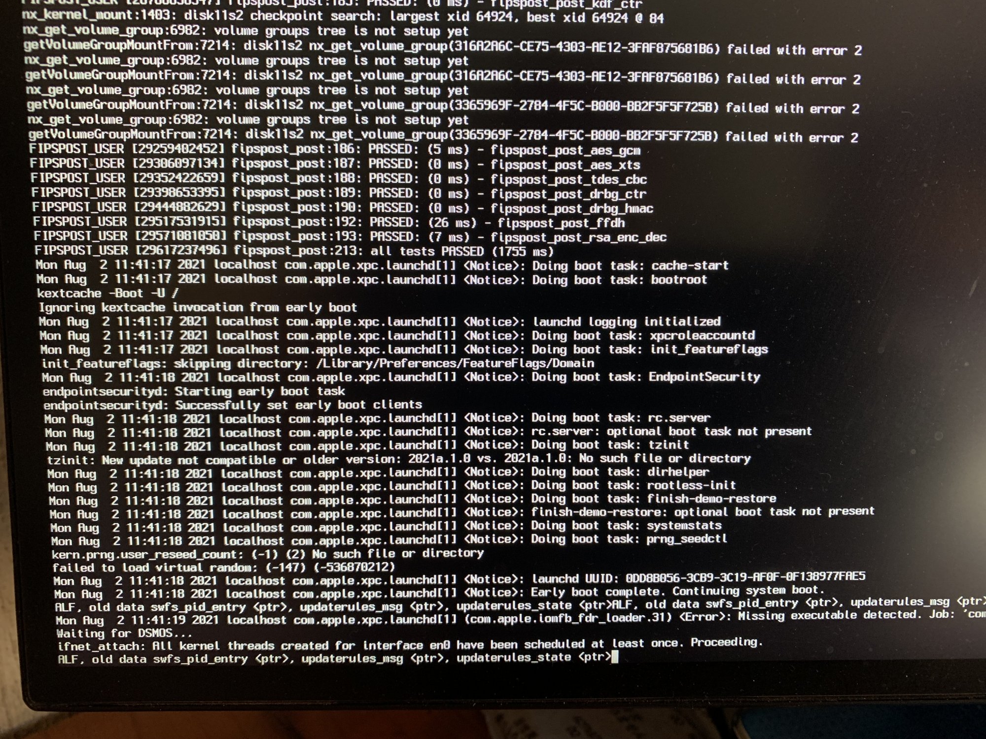 I replaced the battery in my Mac and now am unable to boot back to the drive I was using (SSD in bay 1). I am running from a Carbon Copy clone at the moment but it is over a week old. The booting process always stops at the same place (I am using latebloom so I have the -v option on). Mojave and this backup boot fine. Can anyone see from the verbose list what the problem might be? I would hate to have to erase it and start again!