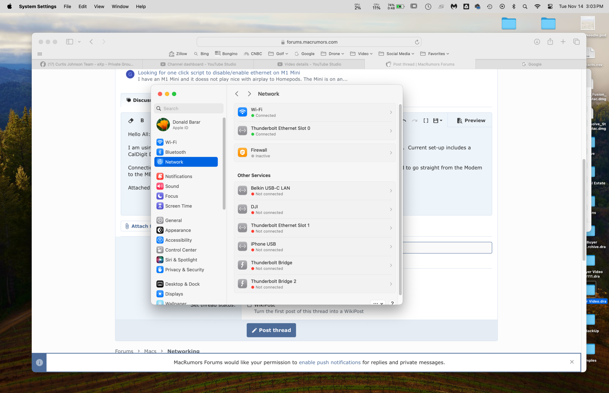 Attached is screen shot System Settings>Network appears. WiFi connected but none of the Thunderbolt Ethernet Connections are show connected (this image was take when connected via the Docking Station and DOCSIS 5.1 model).
