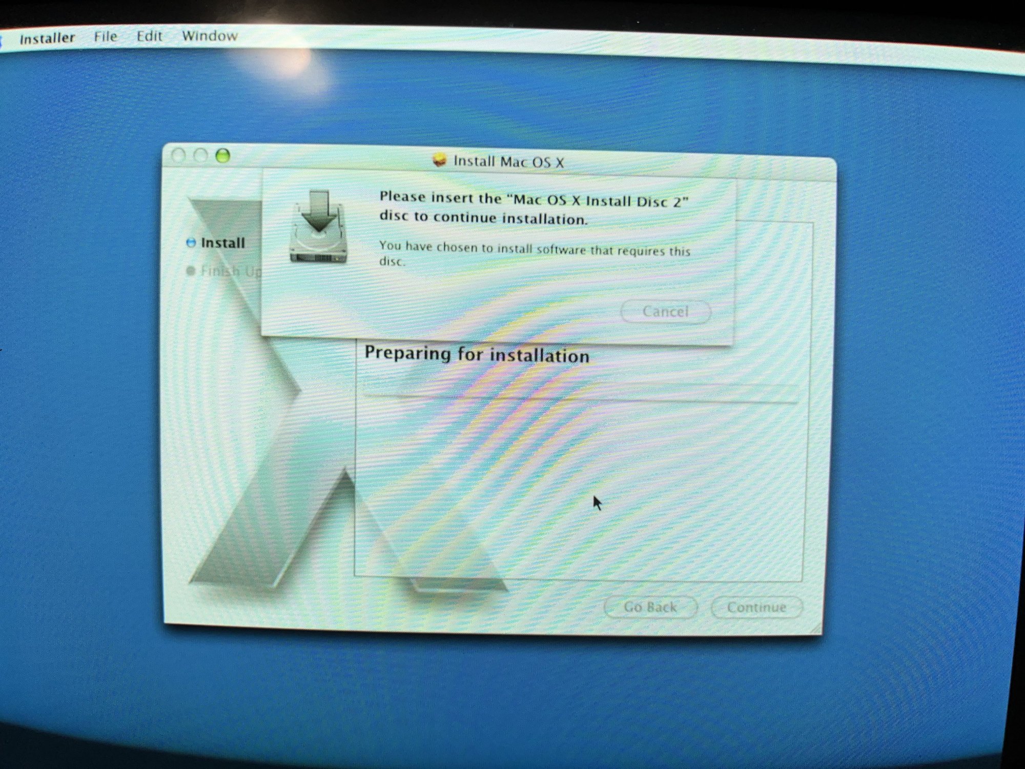 I've been attempting to install Mac OS X v10.2 onto my iMac G3 that I just bought off eBay. I purchased some installation discs and I get an error when I insert the "install disc 2" I believe I have bought upgrade discs and not a full installation disc but I am not able to find exactly what I need on eBay. Could someone provide a picture of the disc I need so I don't buy the wrong ones again? I've attached pictures of the installation disc I have and the error message. Thank you!