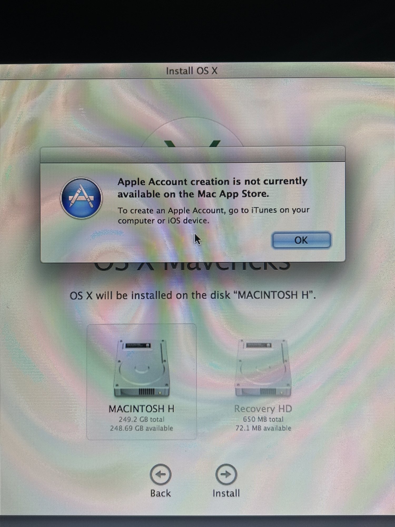 In an attempt to reset my iMac I have lost the ability to reinstall Mac OS X. When I attempt to download Mac OS it requires me to login to the App Store but won’t allow me. I know my information is correct when i try to login but i keep getting the pop up included. Please help.