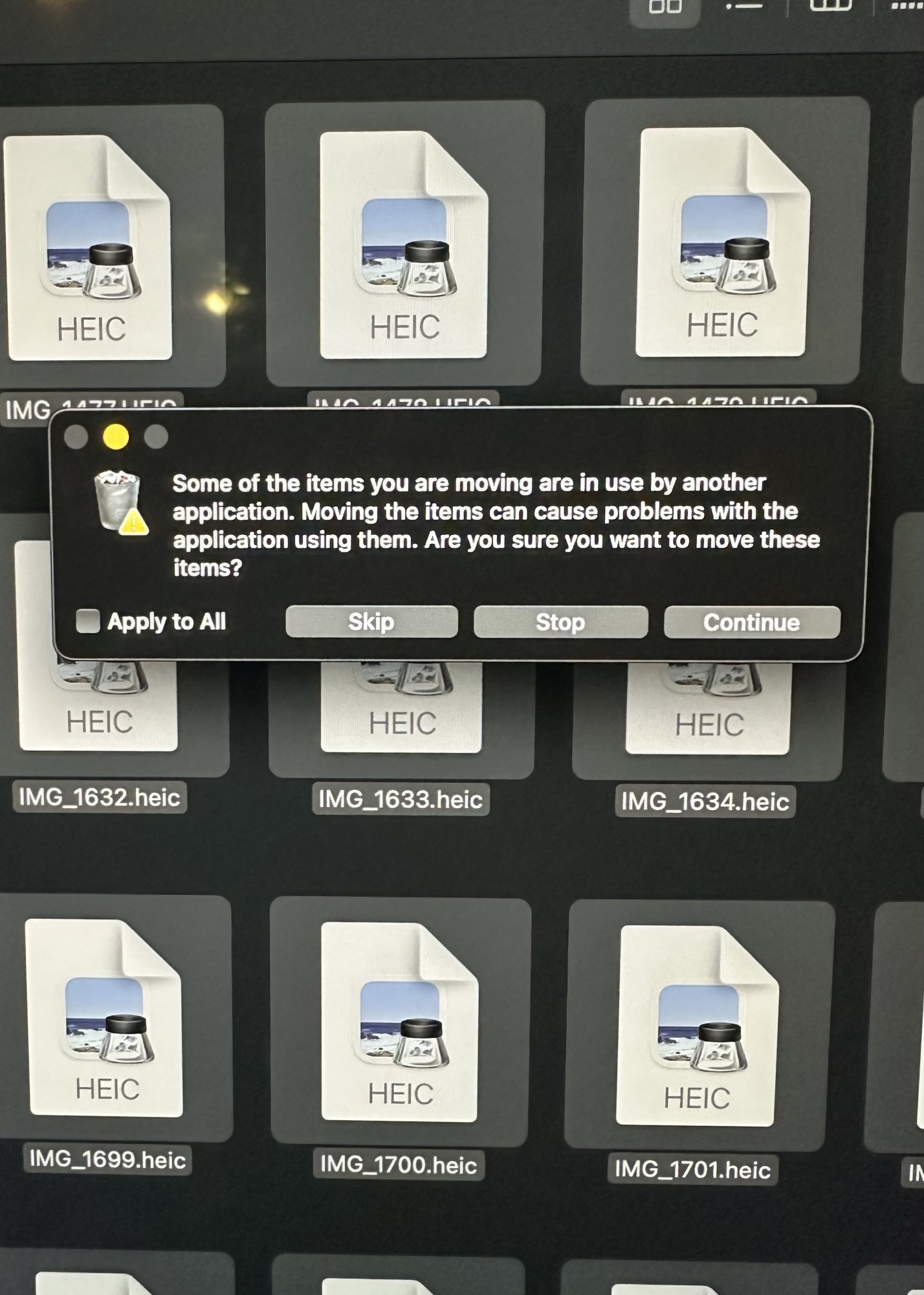 When I noticed these files in my download folder last night, I tried to trash them and I’m getting this pop-up seen in the picture. Could this be because my external hard drive is plugged in at all times and good versions of those messed up files are now in my download folder as well as the external hd? Could the external hard drive be the app using the files and the reason I can’t trash? Should I eject the external hd? Ever since I pulled the flash drive last week my computer seems to be acting weird.