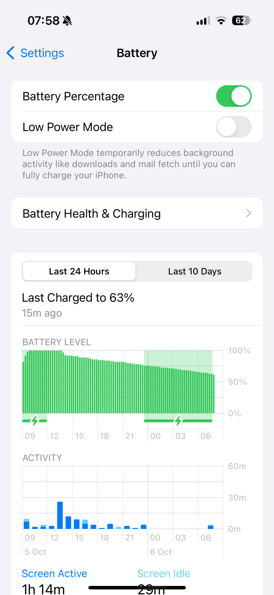 Please can someone please explain the attached BATTERY LEVEL Graphic - which shows my iphone 15 on charge between midnight and 7 a.m. but is only “Last Charged to 63%”. What does the light-green ‘greyed’ out area mean between the sloping downward battery level and the 100% Level. I don’t know why the Level should gradually fall over night - with no activity as shown on the ACTIVITY chart until after 6 a.m. (Though Charging Optimisation is set to Optimised (with a Maximum Capacity of 100%) I’ve not seen any “optimisation messages” reported)