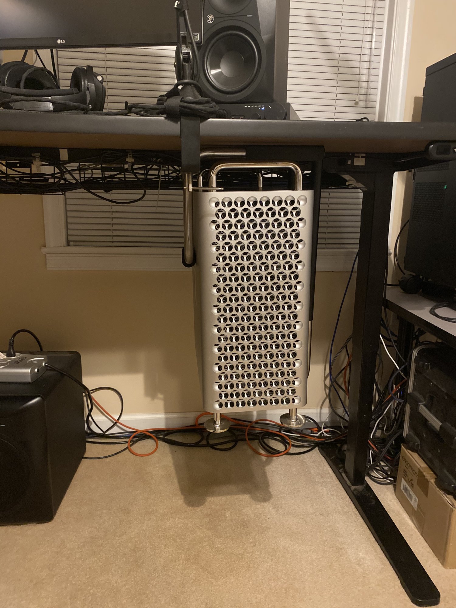 Anyone care to advise for a slick, under the desk mount for the Mac Pro (2019)? I have a standing desk that stretches the cables beyond possible if I leave it on the floor, so suspending the tower under the desk is my only option.