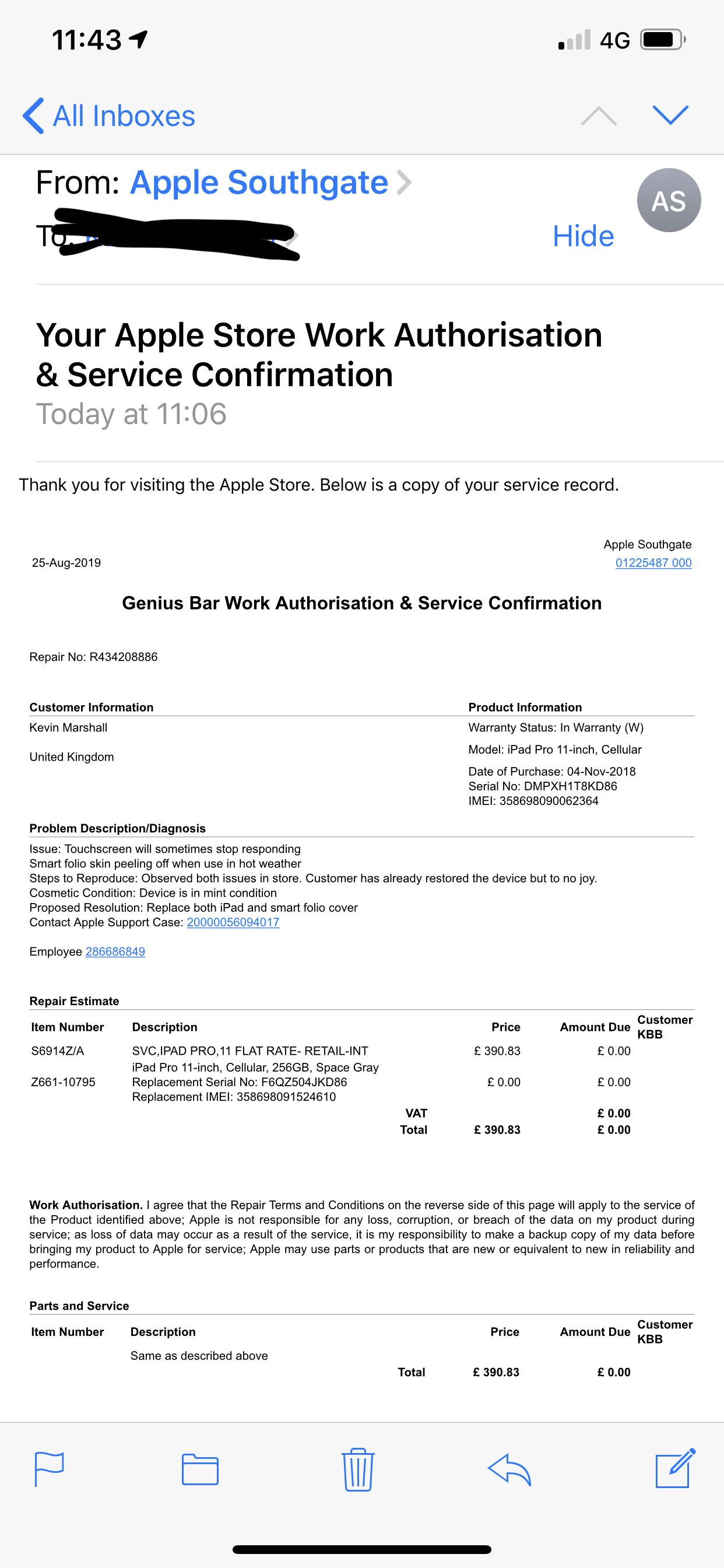 He offered to run a diagnostic check which I said ok to so he ran the check and told me that the iPad was definitely faulty and needed replacing. He immediately ordered a new iPad 11” and folio case and both will arrive on Wednesday. That’s pretty good service.
