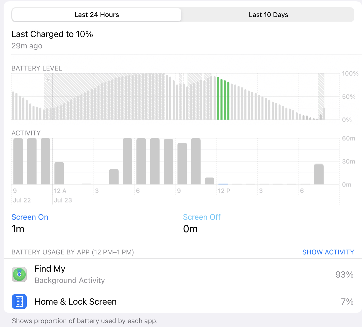 Never had a problem with Find My. Today I left the house around noon with the iPad charged to 95%. I came back before 7 PM — the iPad was dead. Complete battery drain with the main culprit evidently being the Find My app. It ran at around 93% for the entire time I was gone. Had my iPhone and my AirTagged keys with me, but I often do this and never had the issue before. I have 14.7 loaded on everything. Hope this is a fixable bug.
