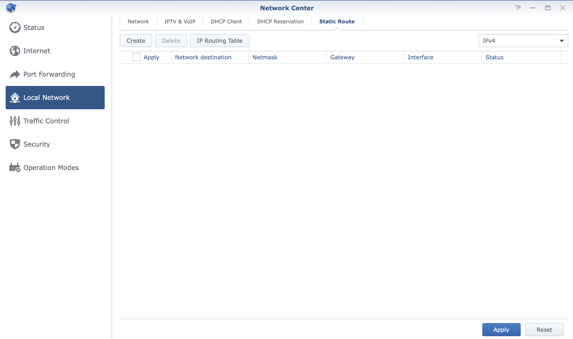 In SRM if I go to Network Centre/Local Network/Static Route/IP Routing Table, there's an entry in there with the following settings: