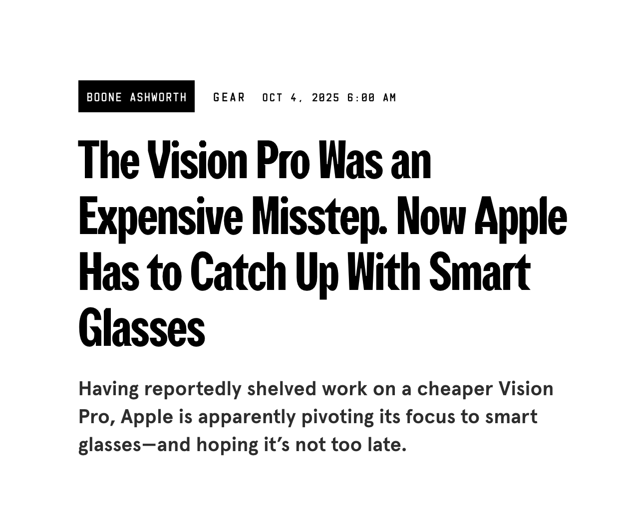 If anything this may be more of a sign Apple is shifting resources from spatial computing to AI. That is the most likely outcome of anything I’d buy into as to what’s going on. “Smart” glasses and HUD glasses are more of an AI product. Which lays a strong foundation for true augmented reality glasses down the road also but again fundamentally different from visionOS.