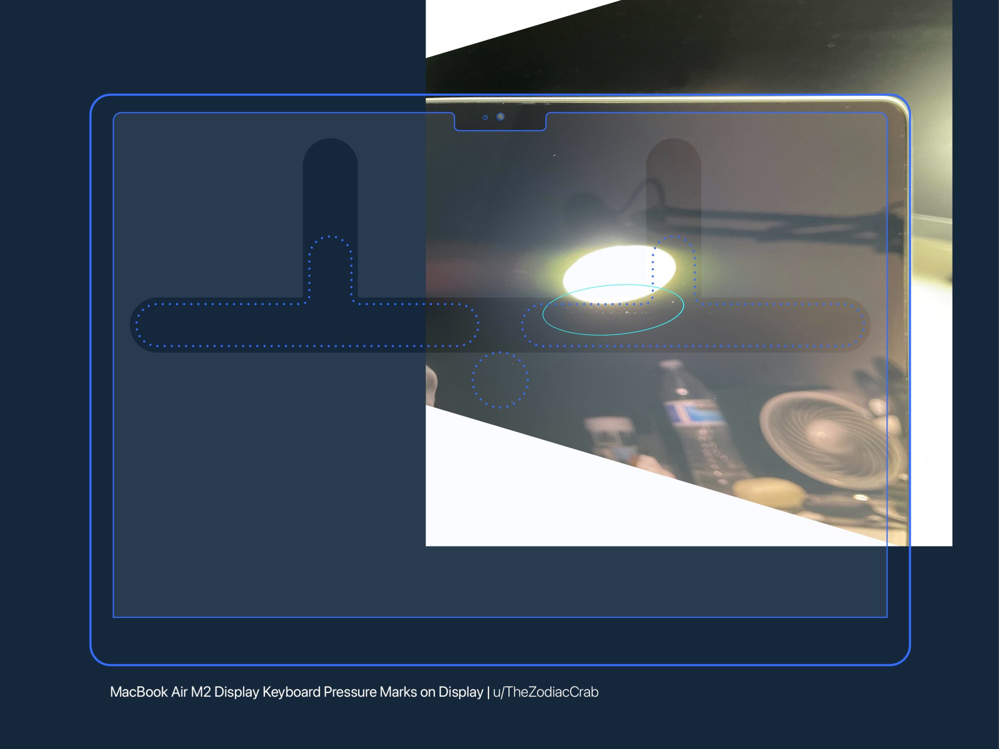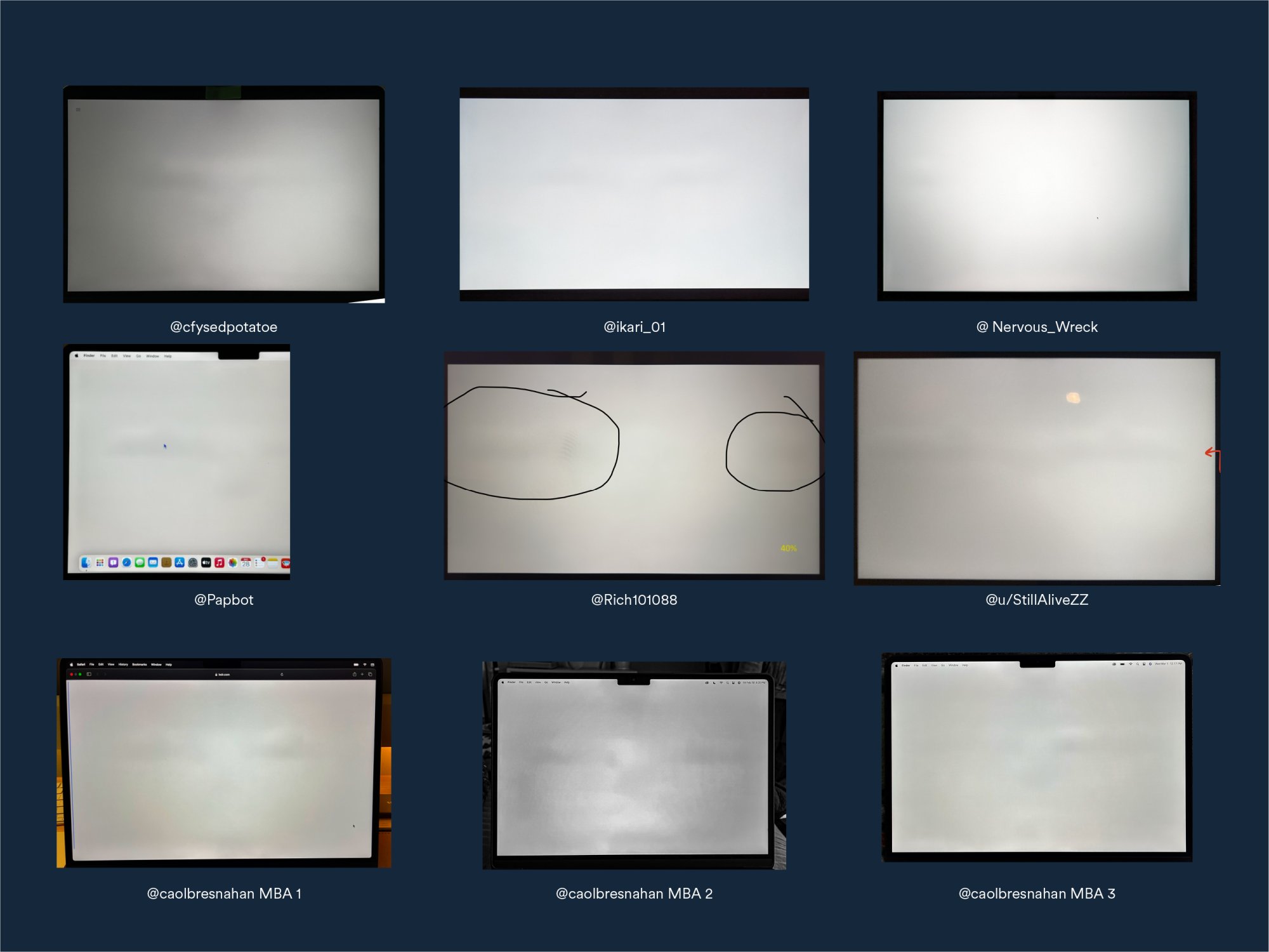 Posts from Reddit & MacForums showing screen defect on mostly BTO M2 MBA & 3 separate, exchanged BTO orders of my own. In some images lighting was altered to enhance the issue.
