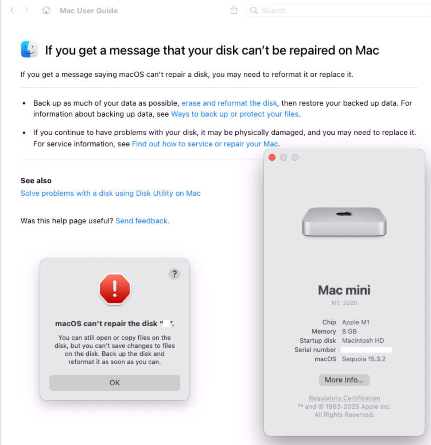 However, running First Aid from disk utility will report the volume as "bad", and leave it unmounted. Restarting will bring up the error message (backup your data...) and the volume is mounted read-only. To fix, unmount (using Disk Utility) and then manually run fsck using a larger memory allocation. Another option is to run Disk Utility from a computer with more RAM (macStudio in my case).
