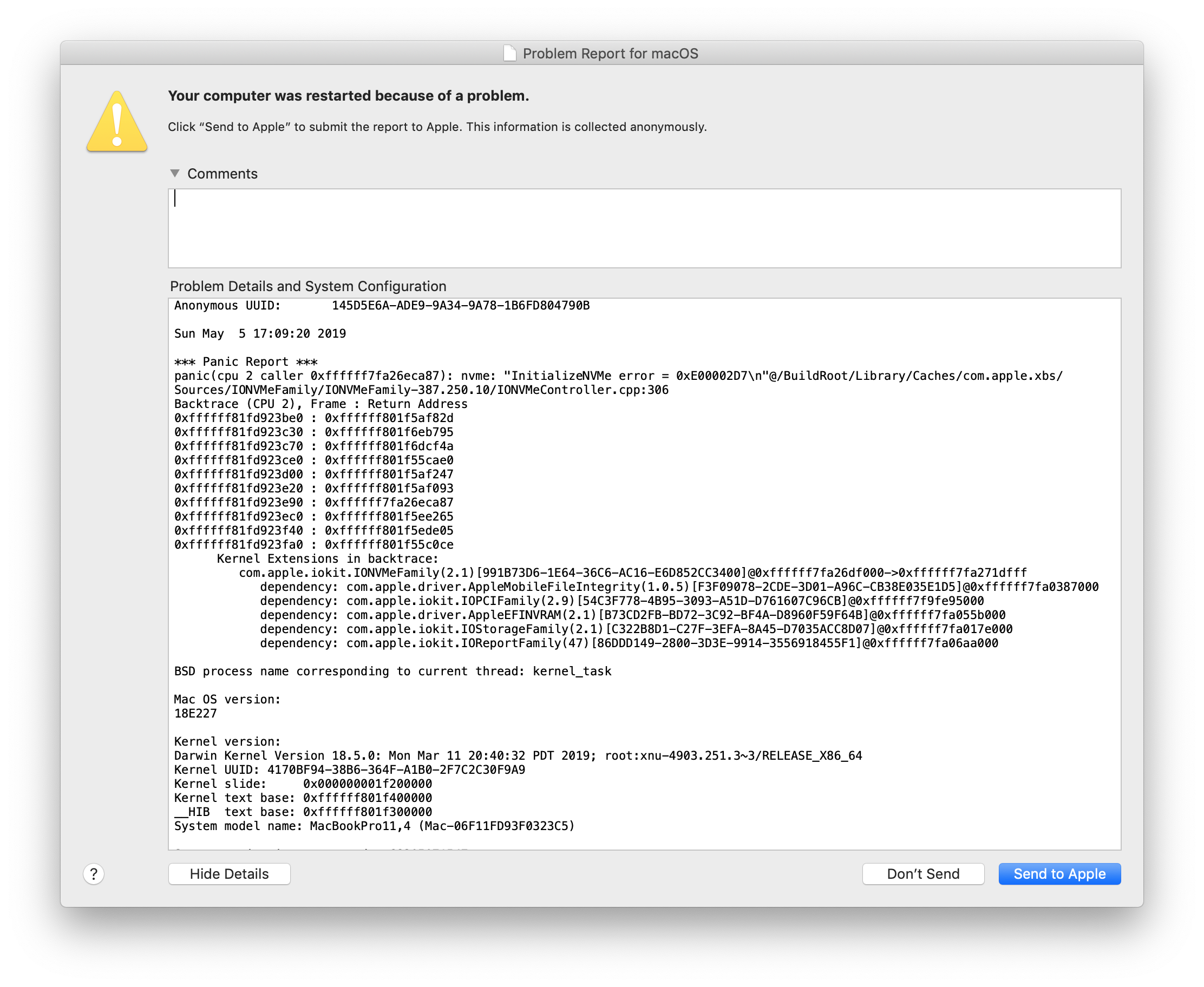 panic(cpu 0 caller 0xffffff7fa09c8a6e): nvme: "Fatal error occurred. CSTS=0xffffffff US[1]=0x0 US[0]=0xa VID/DID=0xffffffff