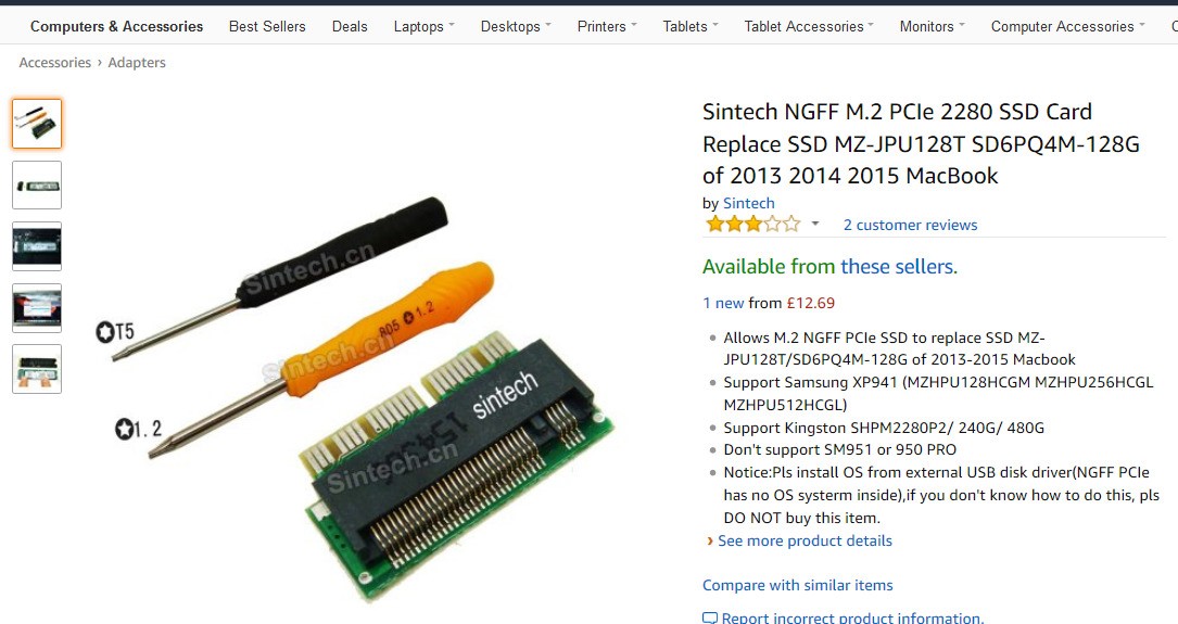 - M.2 PCIe NVMe drives : Work with Sintech adapter. Huge choice of new, low price, up to 2TB.