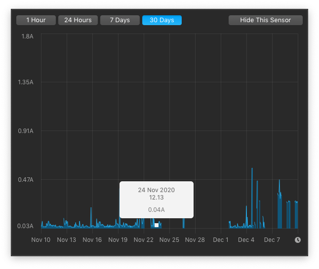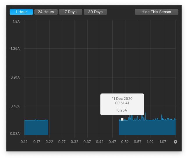 Nice and thanks. We see a drop of 10mA compared to the graph before NVMeFix, that's probably within measurement error. Your graphs look consistent (because I believe your MBP was connected to AC). So I tends to believe NVMeFix contributes that 10mA drop. People have reported from "nothing" to quite noticeable drop, say, 100mA due to NVMeFix. For our WD SN550 + 2015 13-inch MBP, it contributes a 30mA drop.